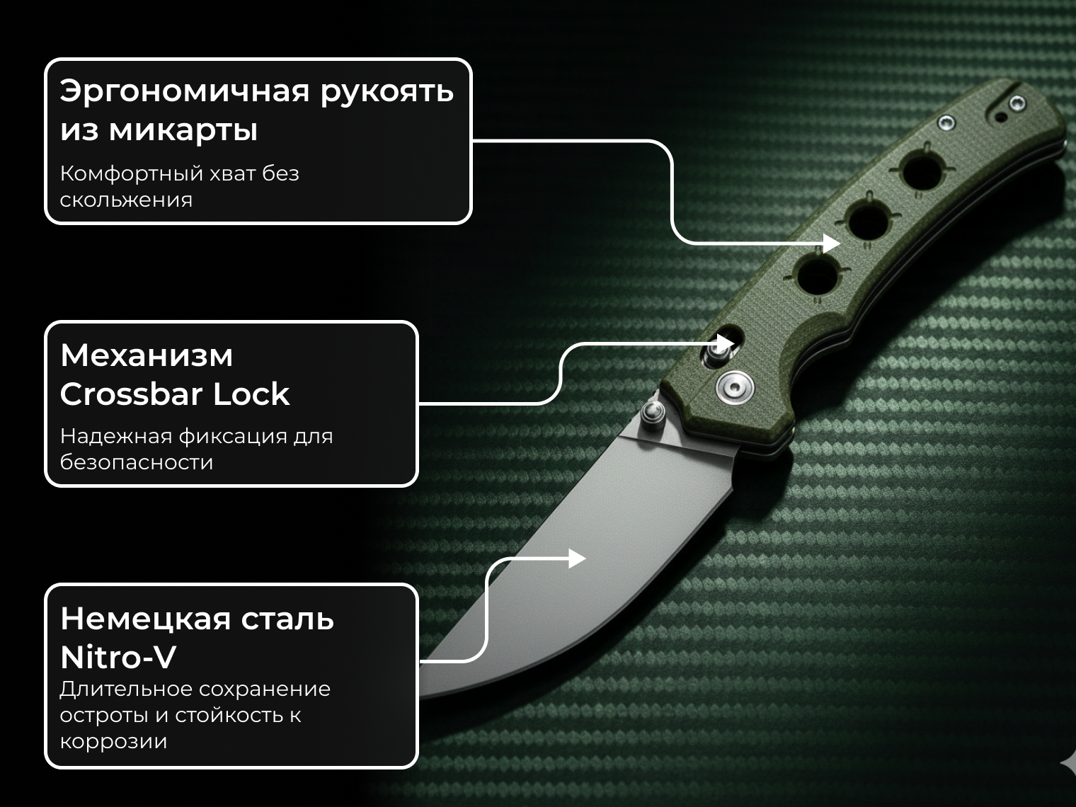Механика ножа настроена на быструю и стабильную работу. Благодаря закрытым керамическим подшипникам в осевом узле клинок открывается плавно и четко. Нож можно мгновенно раскрыть с помощью двустороннего шпенька, что удобно для работы обеими руками. За безопасность отвечает механизм Crossbar Lock — один из самых надежных и безопасных замков, позволяющий сложить нож одним движением, удерживая пальцы вдали от режущей кромки.