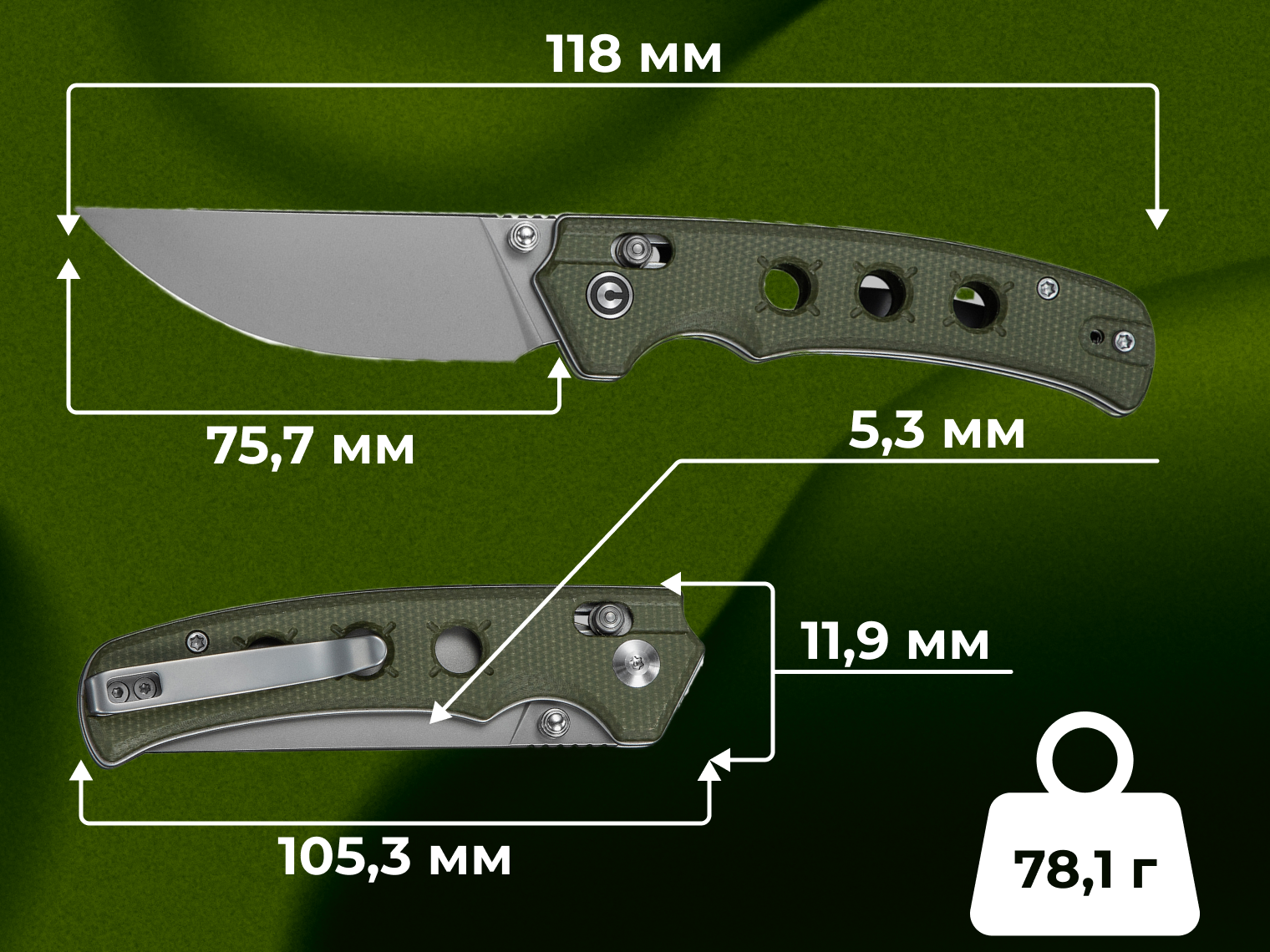 CIVIVI Noctis C24020C-3 — ультралегкий складной нож, который практически не ощущается в кармане. Сочетание оливковой рукояти из микарты и классического сатинированного клинка придает инструменту приятный «теплый» внешний вид и делает его удобным помощником для любых повседневных задач. Клинок изготовлен из современной нержавеющей стали Nitro-V с криогенной обработкой до твердости 59–61 HRC. Она отлично держит заточку и при этом остается достаточно пластичной, чтобы не крошиться при нагрузках. Благодаря небольшой толщине обуха (2,3 мм) и прямым плоским спускам нож демонстрирует исключительный рез — легко и точно проходит через материалы, не застревая в них. Финишная обработка Stonewashed добавляет клинку практичности, скрывая мелкие царапины, возникающие в процессе работы.