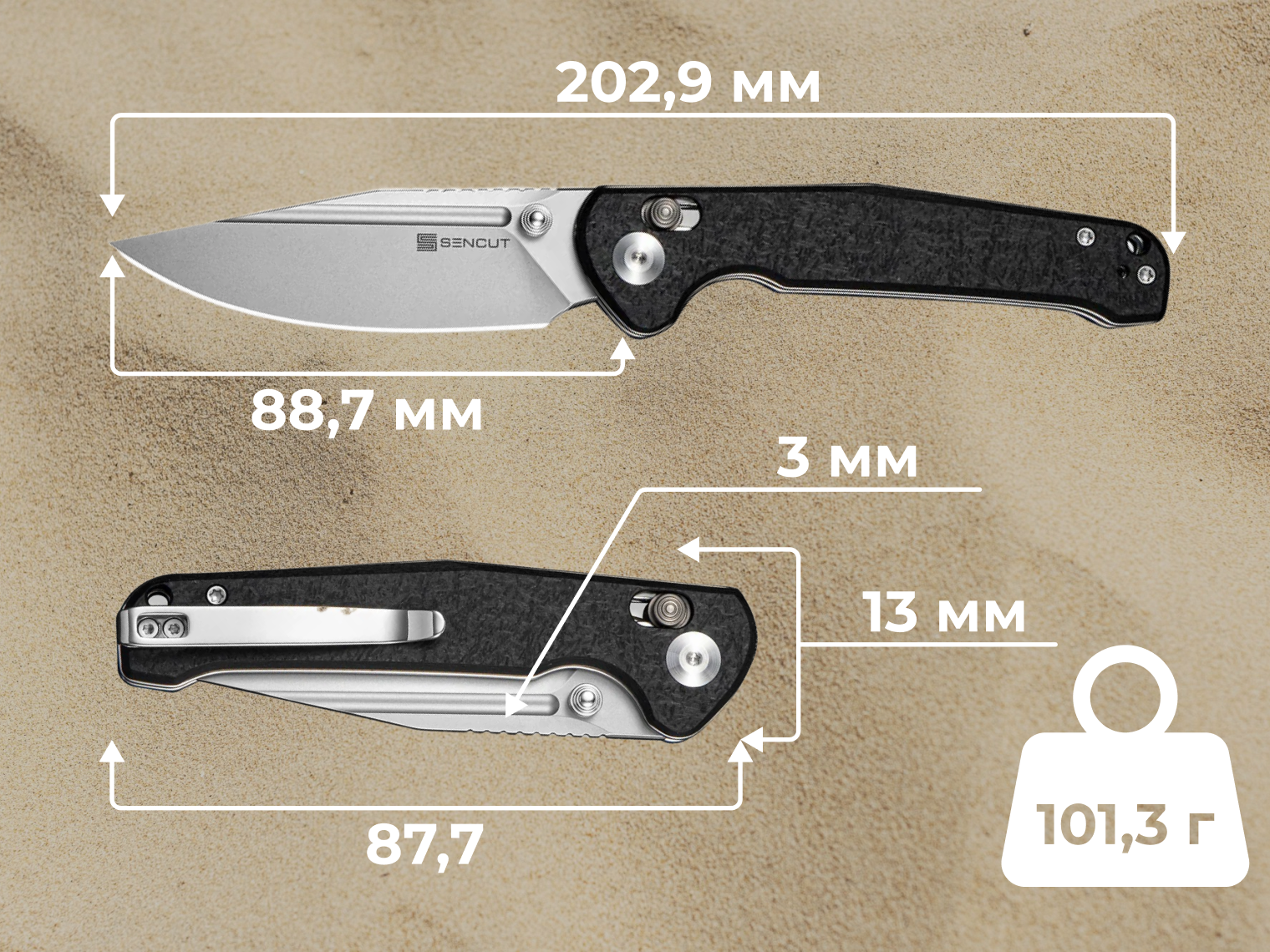 Нож весит всего 101 г, поэтому он почти не ощущается в кармане. Надежная стальная клипса позволяет удобно закрепить его на поясе или снаряжении. Для максимального удобства клипсу можно переставить под левую или правую руку.