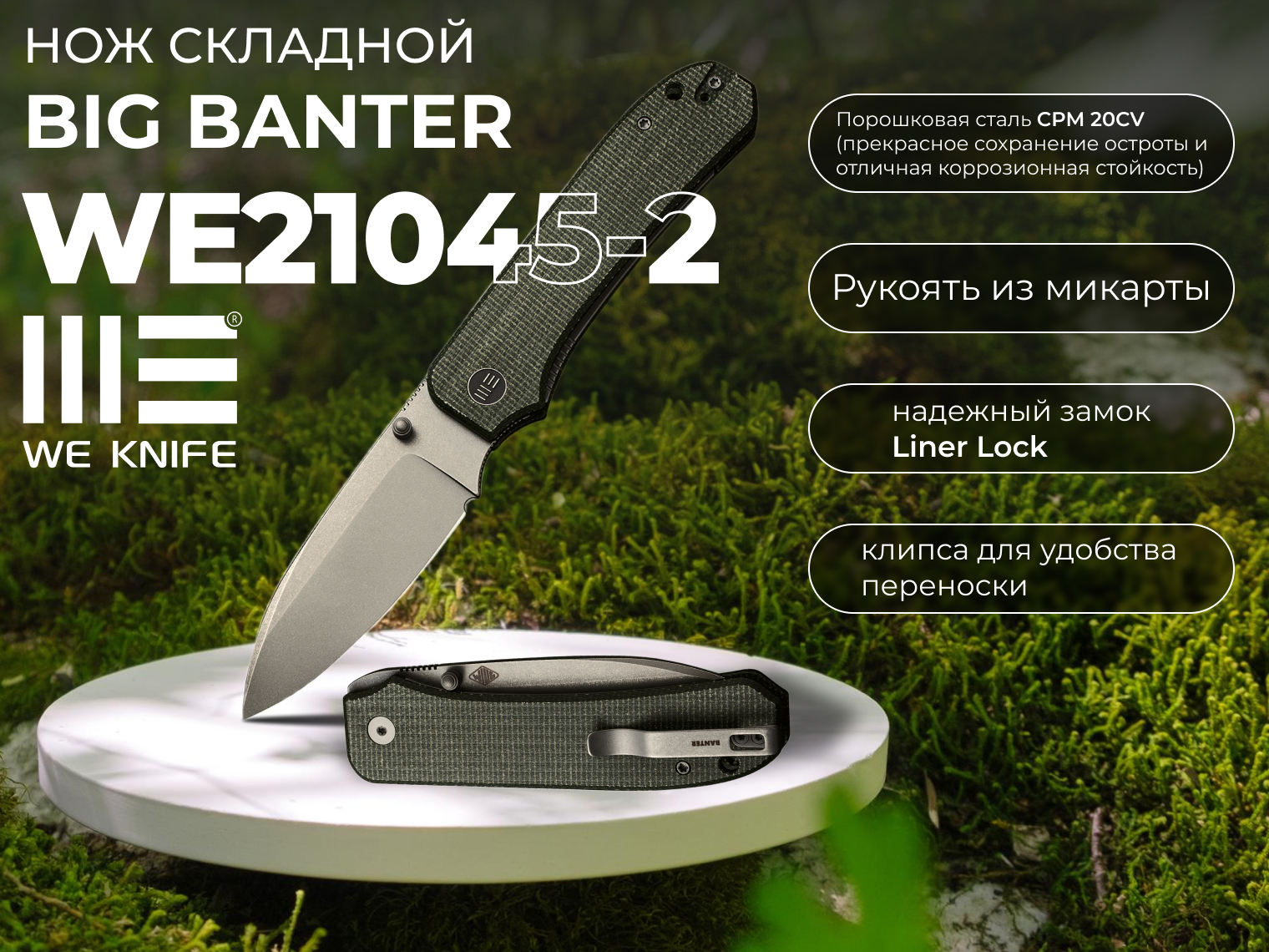 Складной нож Weknife Big Banter WE21045-2 является удобным карманным инструментом. Это – «старший брат» известного ножа Banter. В основе клинка – сталь марки CPM 20CV. Это порошковая сталь премиум-класса. Ручка из микарты прочная и износостойкая. Длина общая инструмента достигает 21,3 сантиметра, длина в закрытом положении составляет 11,8 сантиметра. Вес: 115 грамм.