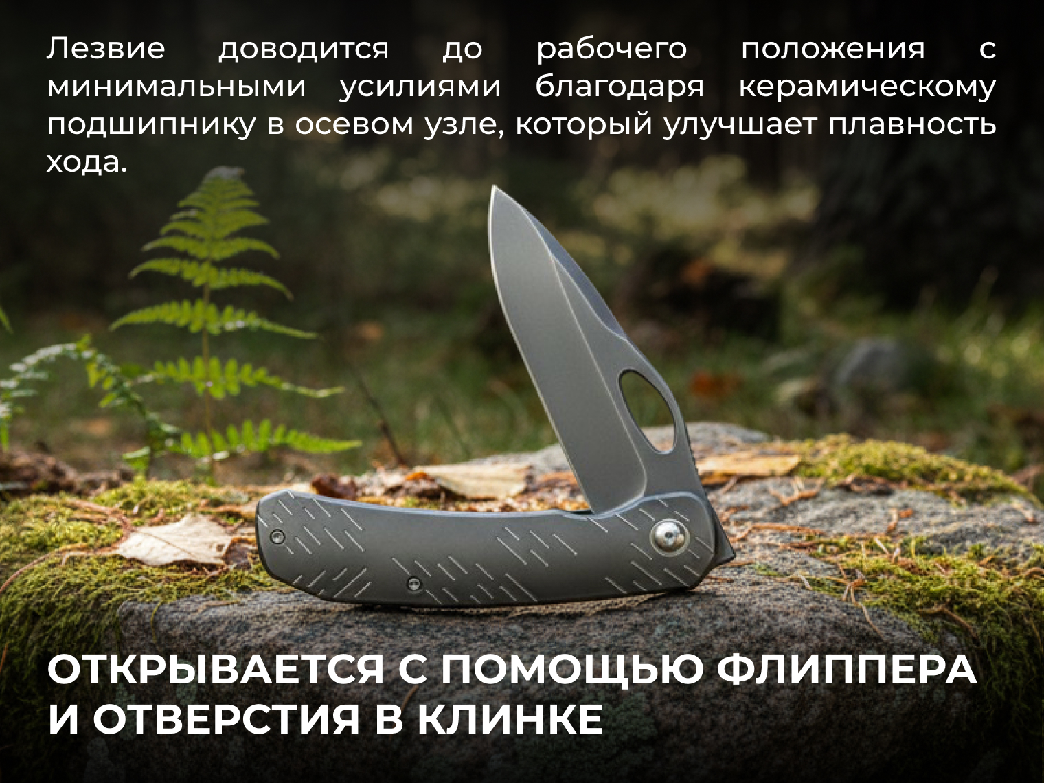 Нож открывается несколькими способами: с помощью переднего флиппера и отверстия в клинке. Механизм фиксации — замок Frame Lock. В основе осевого узла находятся керамические подшипники, что делает ход лезвия максимально быстрым.