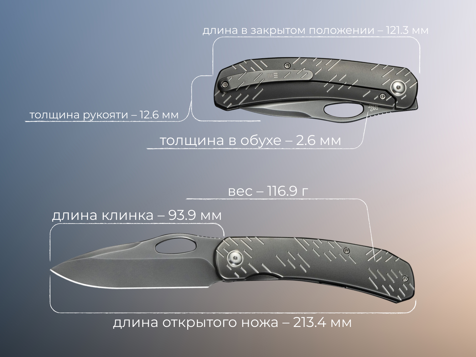- Рукоять из титана 6AL4V. Легкий, прочный и коррозионностойкий сплав имеет фрезеровку для улучшения сцепления с ладонью. Закругленные линии обеспечивают комфорт без риска наминания.