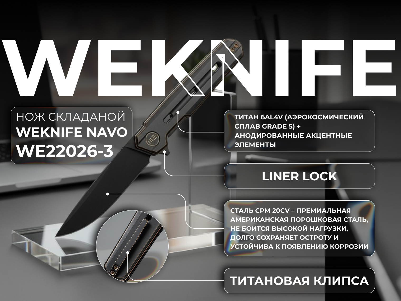 Премиальный EDC-нож WE Knife Navo создан в коллаборации с Остапом Хелем. Клинок Drop Point из порошковой нержавеющей стали CPM 20CV с черным stonewash-финишем. Керамические подшипники обеспечивают мгновенное открывание одной рукой. Рукоять из титана 6Al4V отличается высокой жесткостью при малом весе. Титановая клипса для Tip-Up ношения является двухпозиционной. Замок Liner Lock.