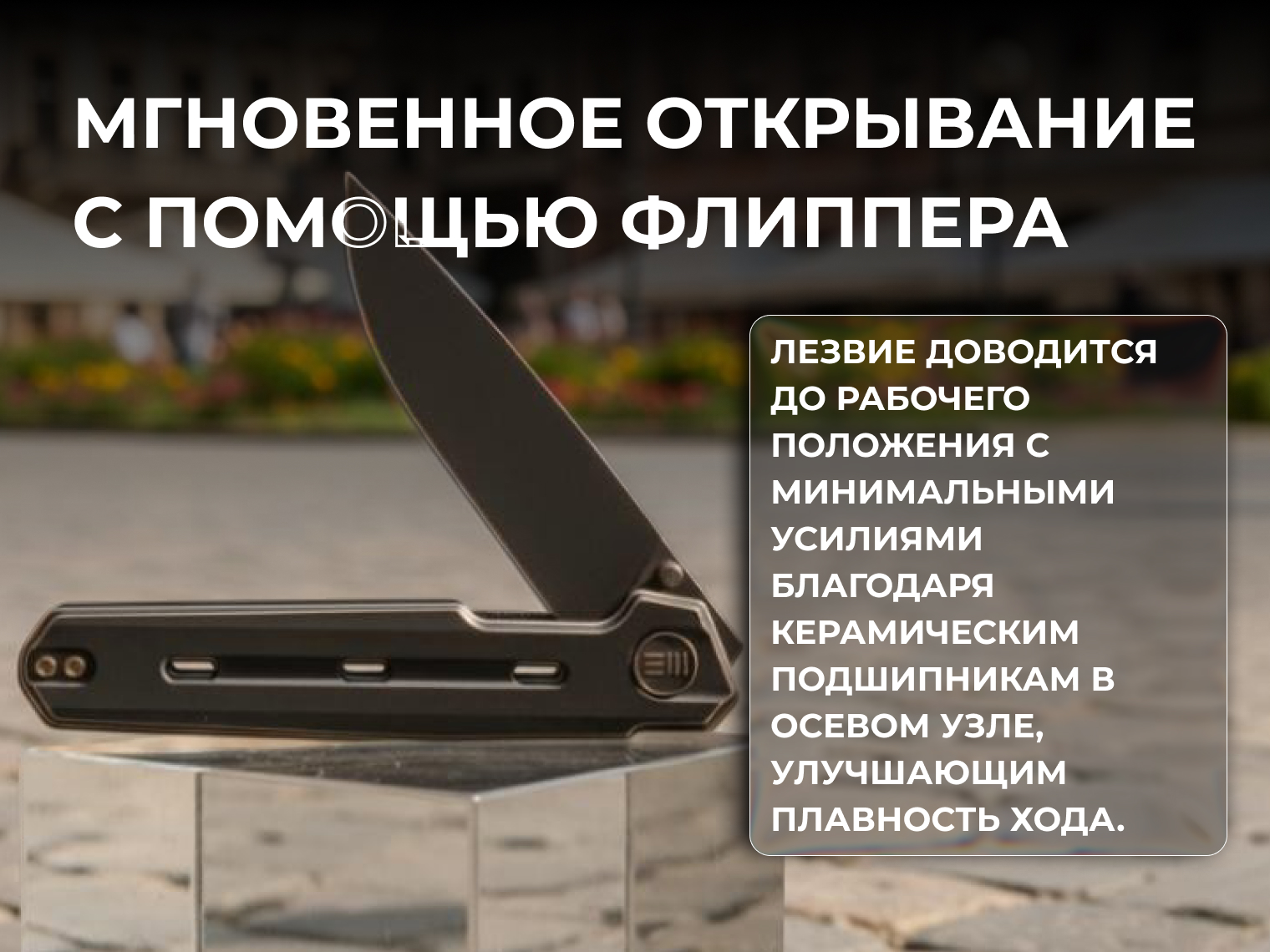 Нож открывается мгновенно — достаточно надавить на плавник флиппера. Благодаря керамическим подшипникам в осевом узле движение выходит плавным и предсказуемым, а мелкие насечки на обухе упрощают упор пальцем для максимального контроля лезвия при силовой работе.
