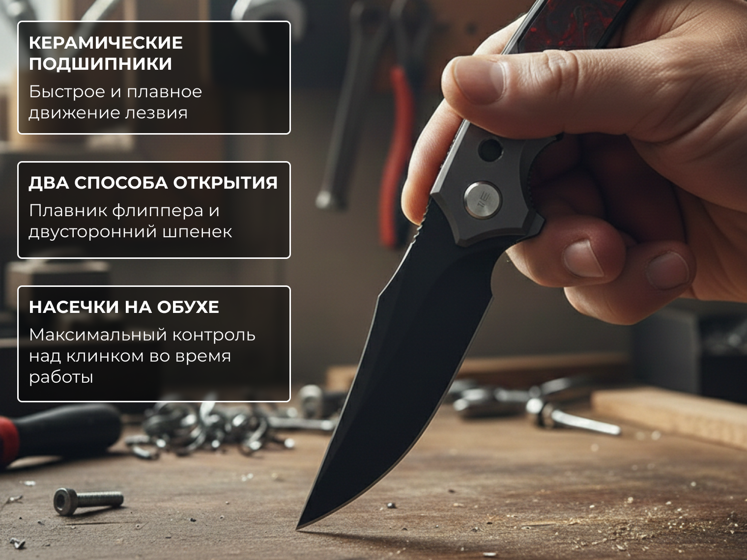 - материал рукояти — титан 6AL4V (Polished Gray) + вставки Black & Red Carbon Fiber;