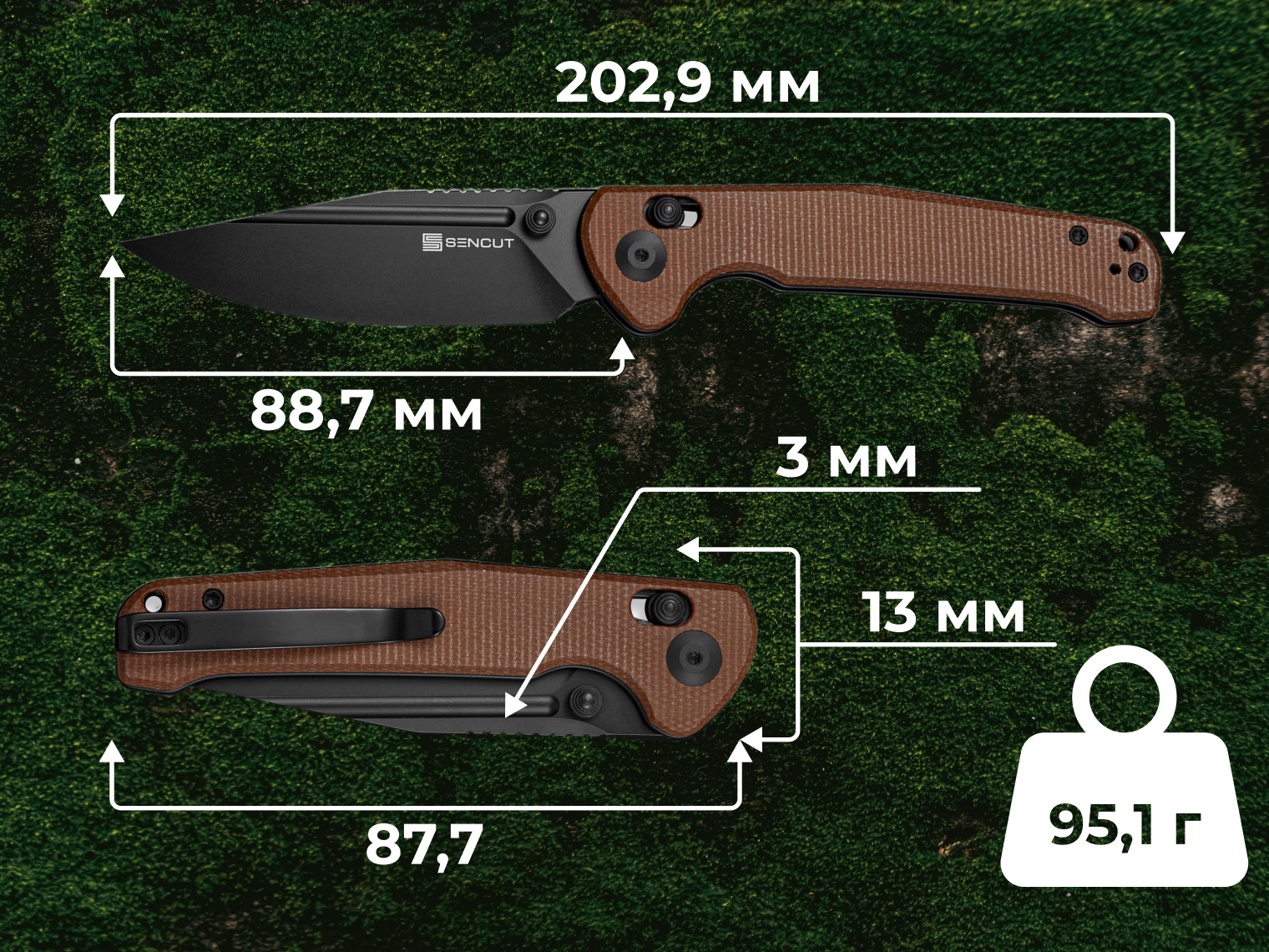 Ніж важить усього 95,1 г, тому він майже невідчутний у кишені. Надійна сталева кліпса дозволяє зручно закріпити його на поясі або спорядженні. Для максимальної зручності кліпсу можна переставити під ліву або праву руку.
