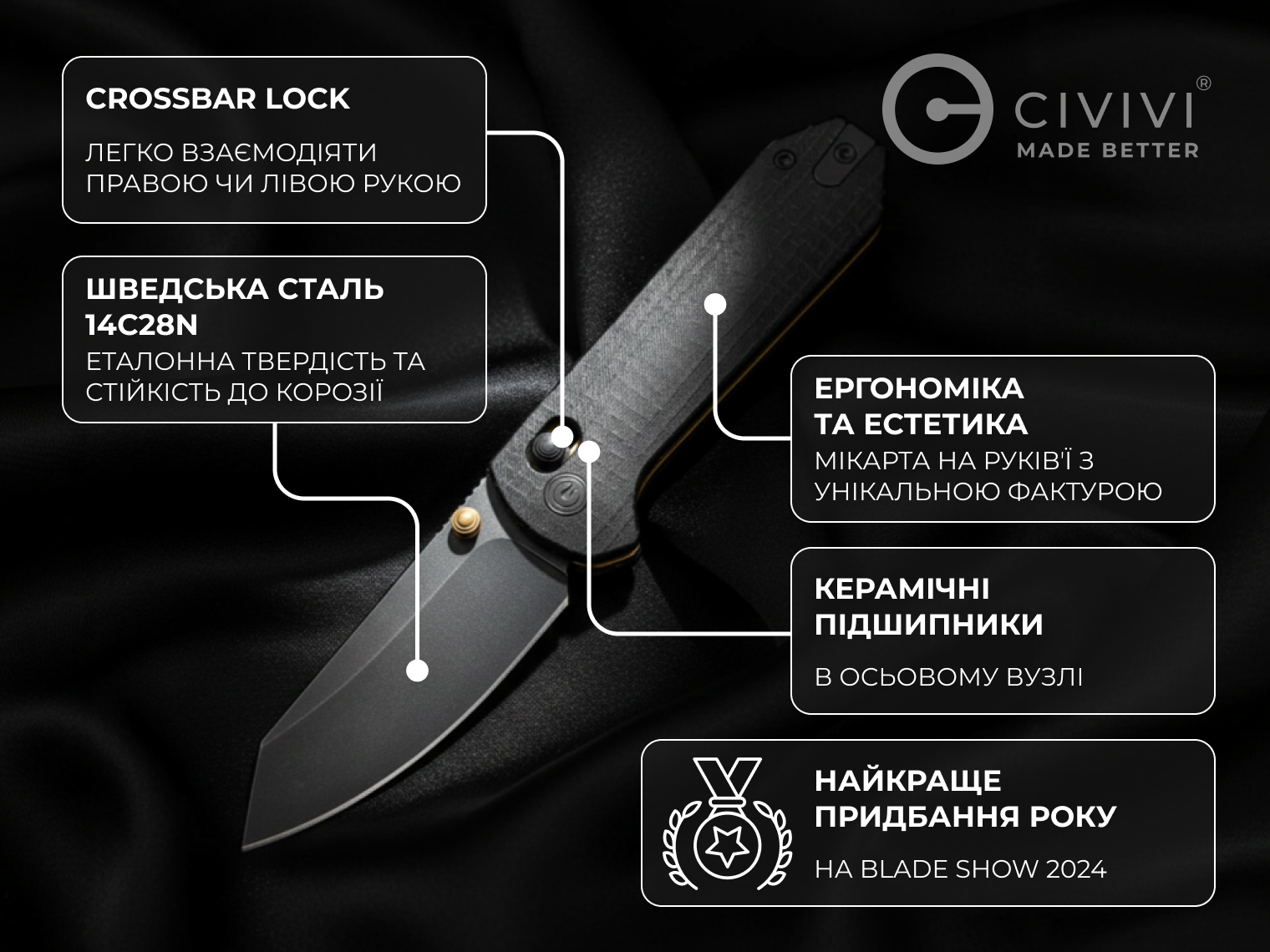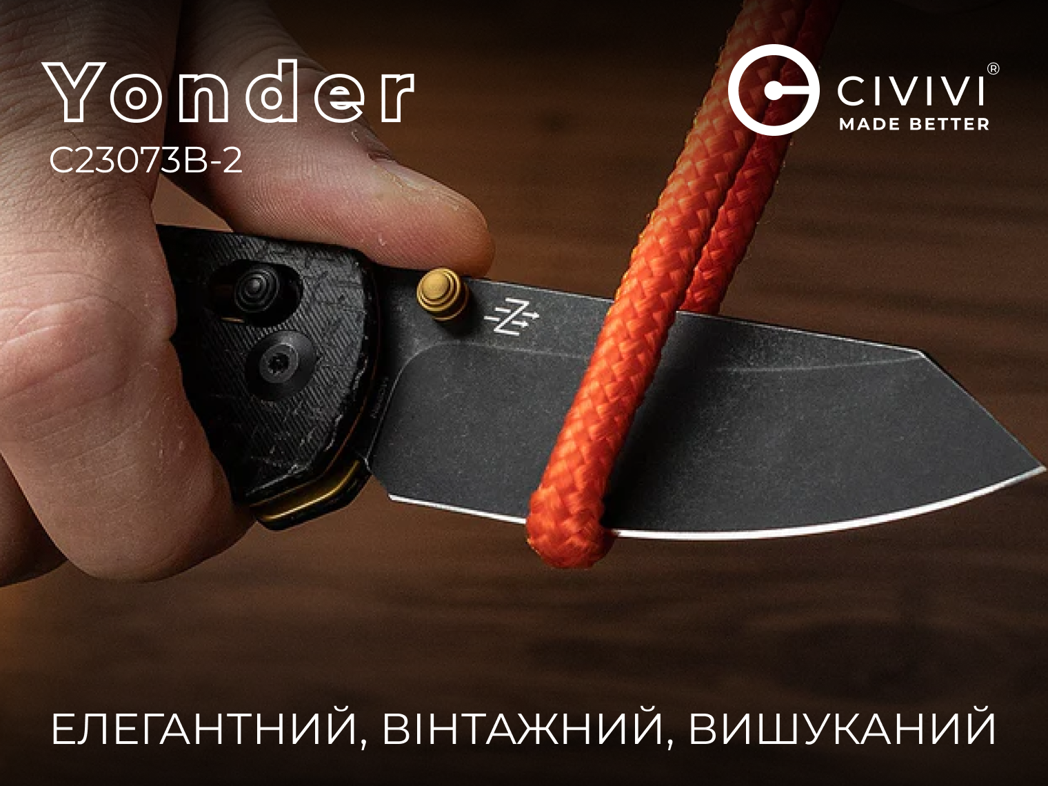 Civivi Yonder — володар титулу «Best Buy Of The Year» за версією Blade Show 2024. Це офіційне визнання того, що ніж є найкращим варіантом за співвідношенням ціни та якості. Дизайнер Зак Вітмор створив інструмент, який при вазі всього 71,7 г відчувається в руці як надійне продовження долоні. Це робочий ніж з професійними характеристиками, розрахований на інтенсивне щоденне використання.