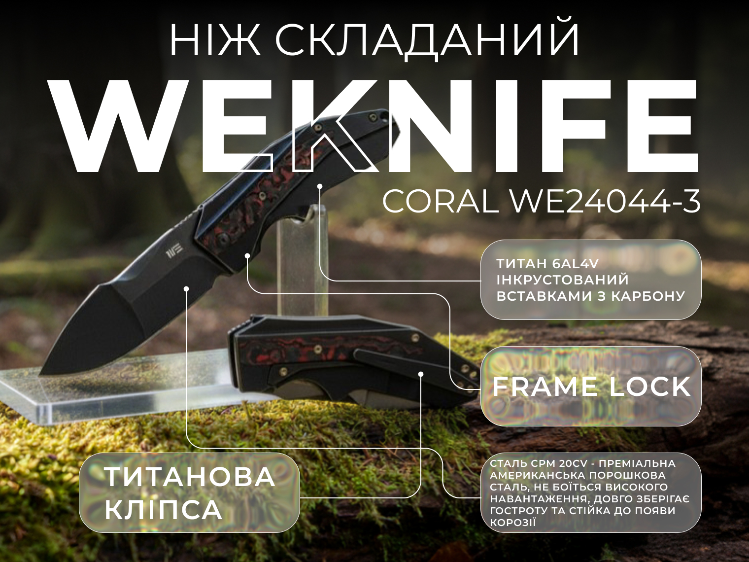 Преміальний складаний ніж WeKnife Coral із замком Frame Lock створений за дизайном Густаво Т. Чекіні. Модель має посилений клинок зі списоподібним вістрям для зносостійкості та можливості роботи на укол. Клинок виготовлений з порошкової сталі CPM 20CV, руківʼя — з титану та інкрустацією з карбону. Ніж відкривається натисканням на фліпер SLT. Керамічні підшипники забезпечують швидкий рух леза.