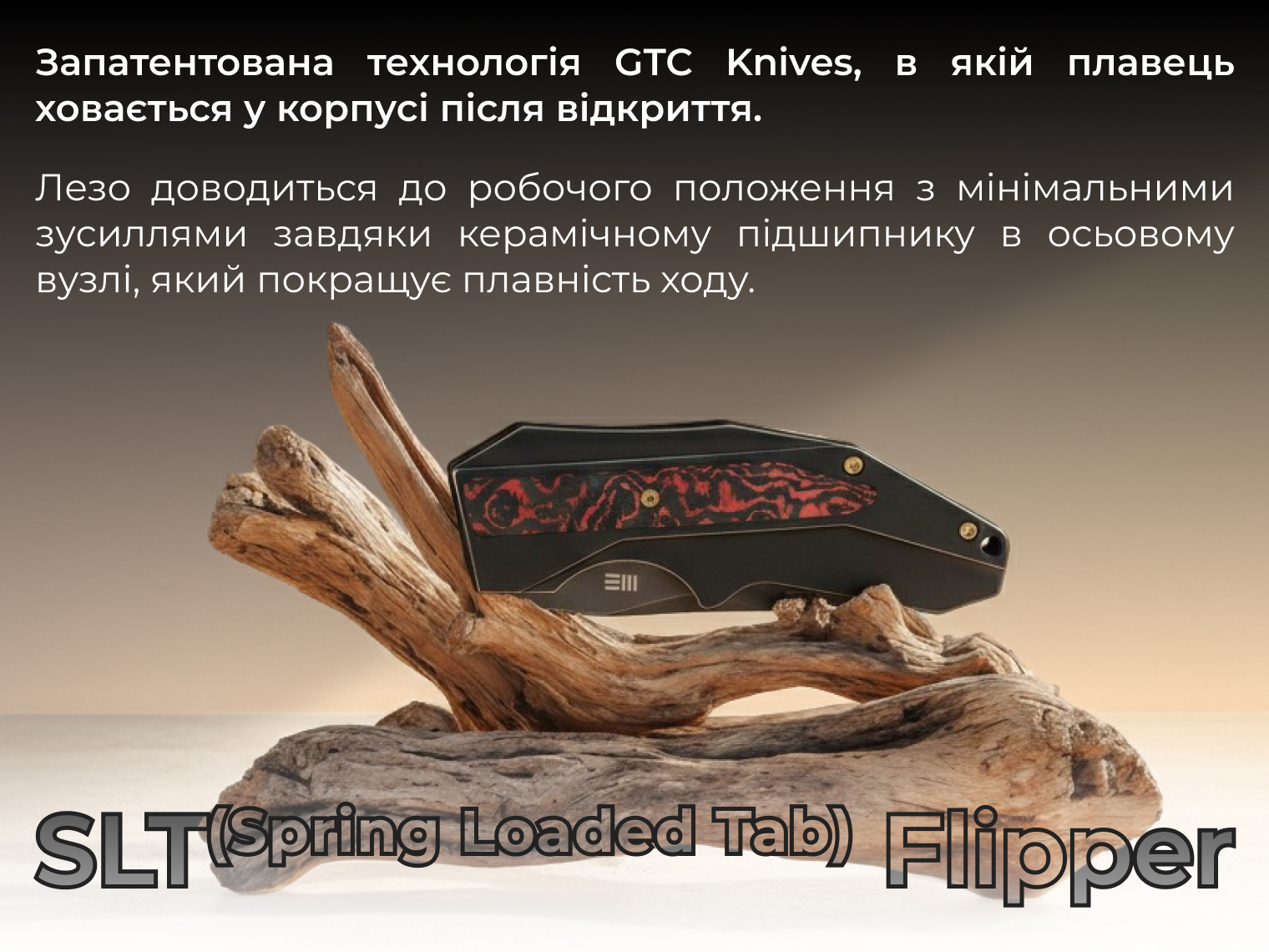 Для відкриття WeKnife Coral використовується унікальний механізм SLT (Spring Loaded Tab) Flipper — запатентована технологія GTC Knives, в якій плавець ховається у корпусі після відкриття. Осьовий вузол працює на керамічних підшипниках, що забезпечує бездоганно швидке відкривання без зайвих зусиль.