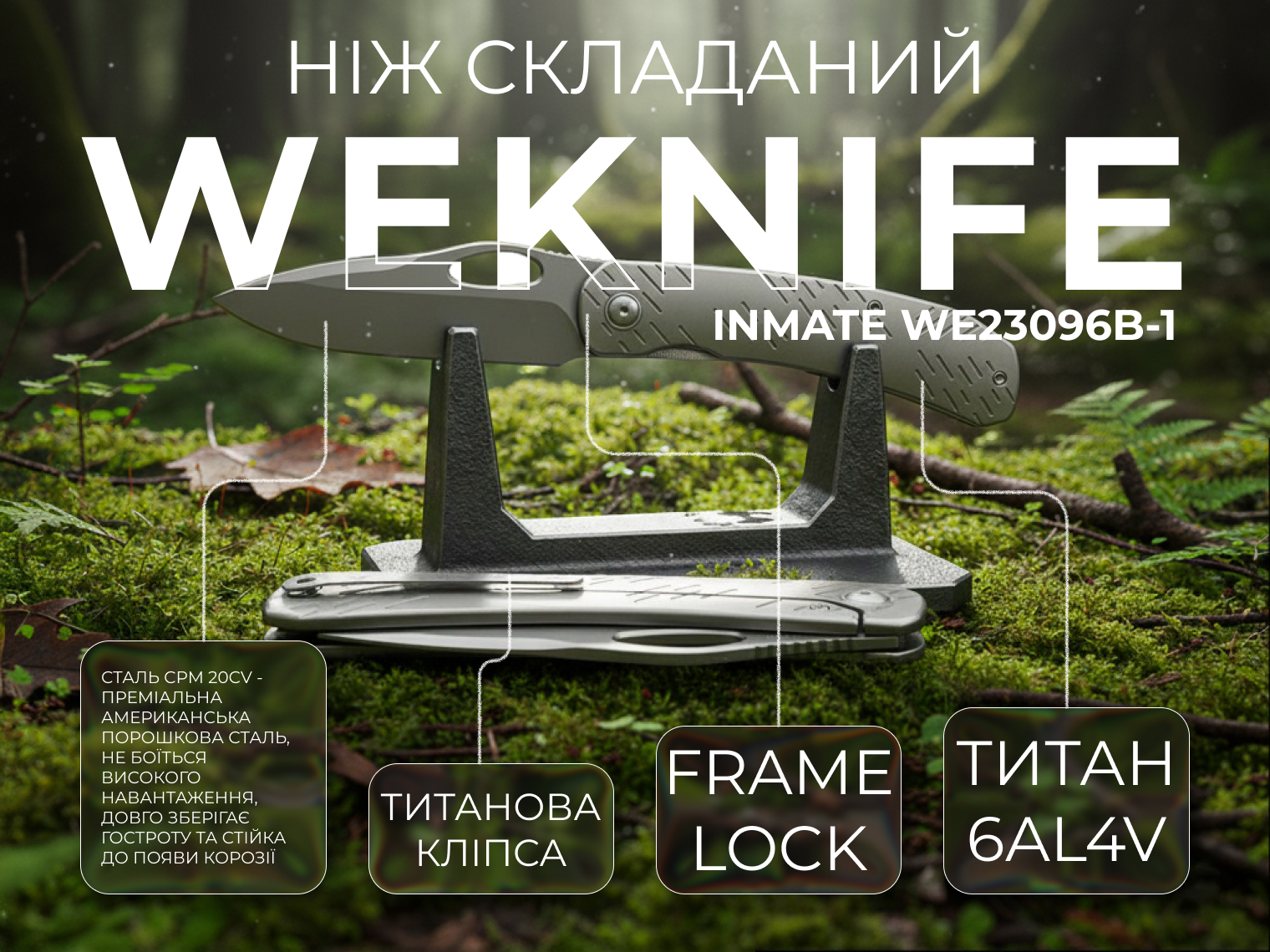 Кишеньковий ніж WeKnife Inmate з преміальних матеріалів: клинок із порошкової нержавіючої сталі CPM 20CV, фрезероване руківʼя з титану 6AL4V. Дизайн Джерада Ніва (Neeves Knives). Миттєве відкриття інструменту завдяки керамічним підшипникам. Замок Frame Lock гарантує надійну фіксацію, а титанова кліпса робить ніж зручним у щоденному носінні.