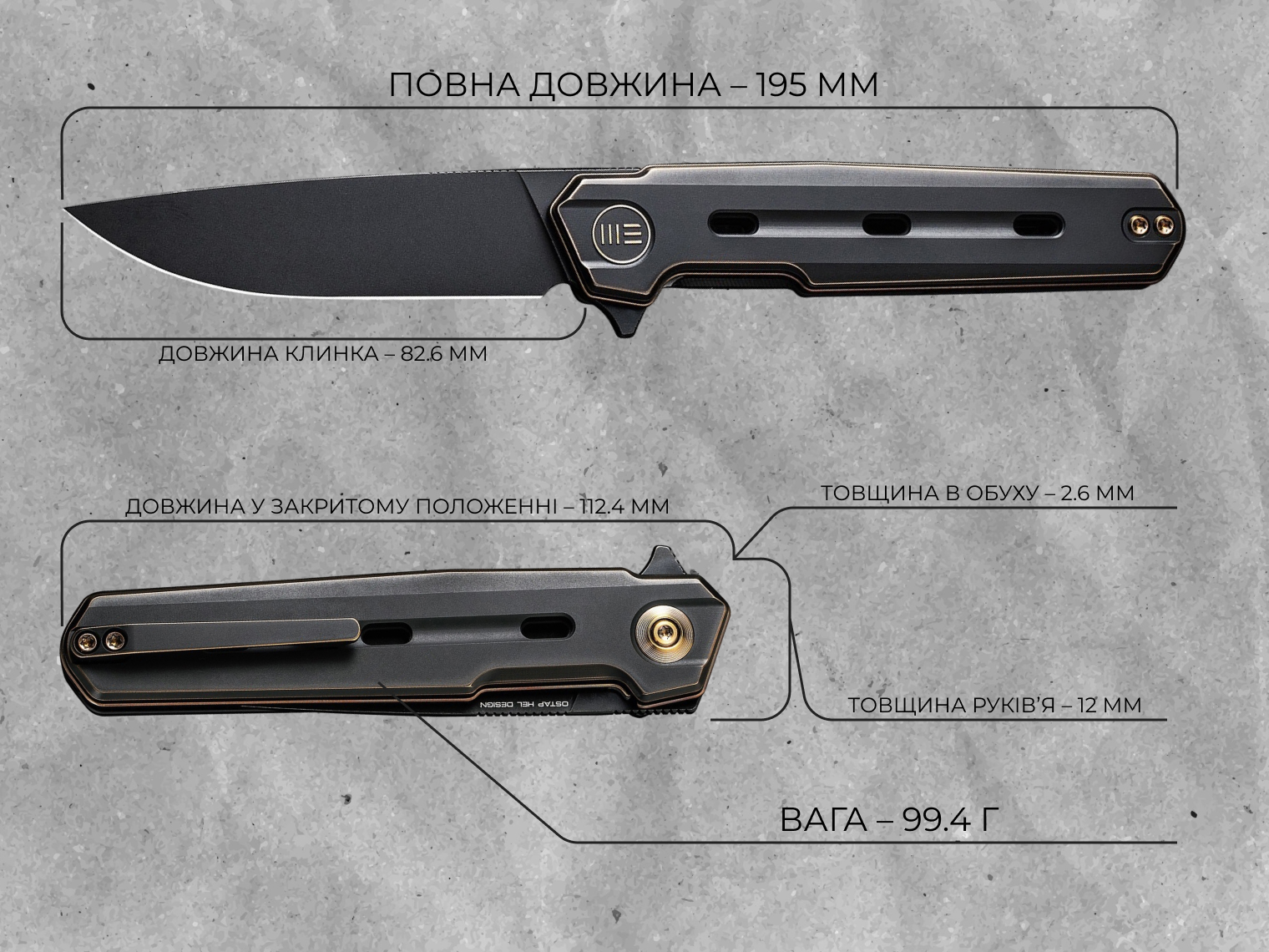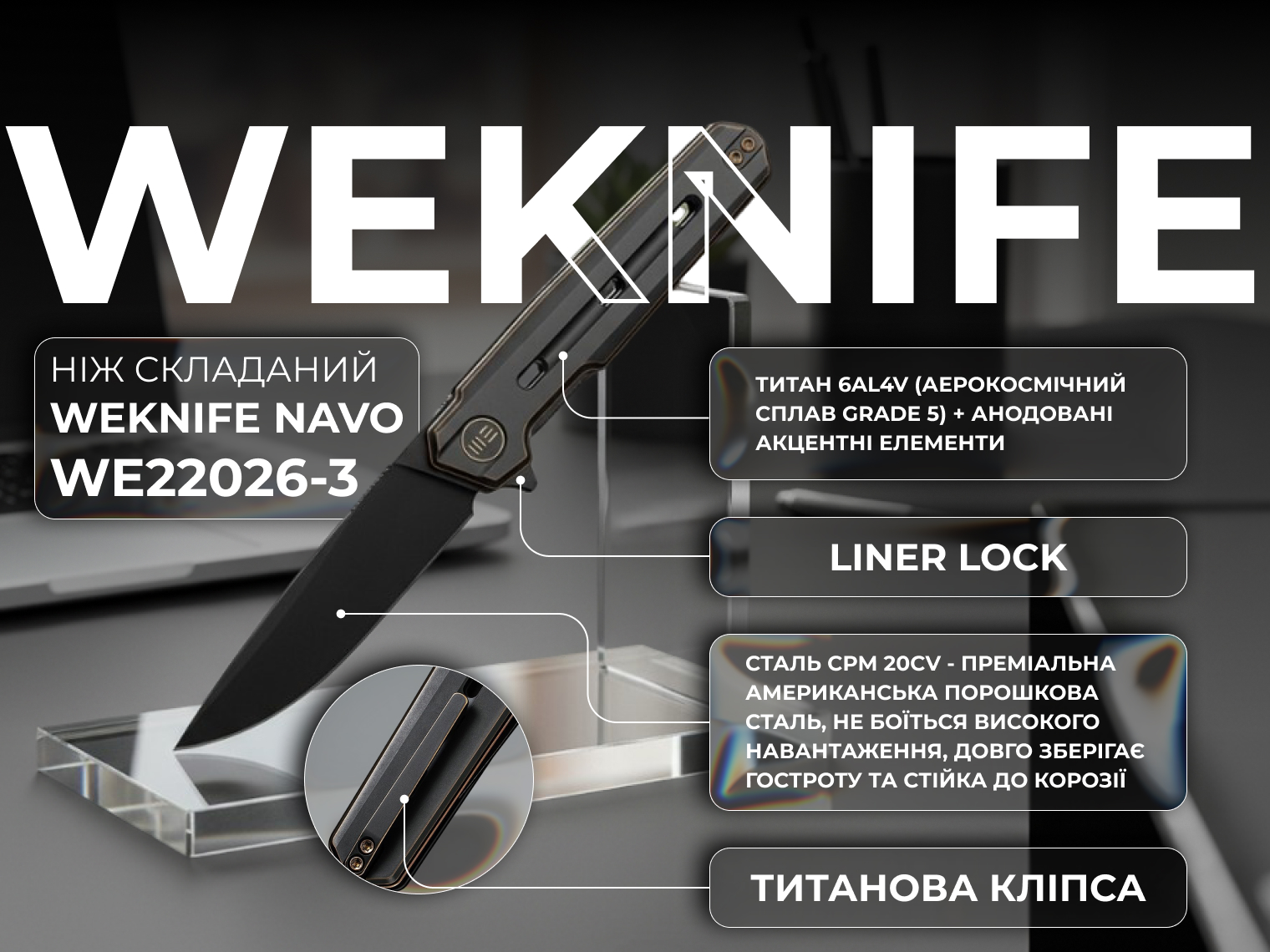 Преміальний EDC-ніж WE Knife Navo створений у колаборації з Остапом Хелем. Клинок Drop Point з порошкової нержавіючої сталі CPM 20CV з чорним stonewash-фінішем. Керамічні підшипники забезпечують миттєве відкривання однією рукою. Руківʼя з титану 6Al4V відрізняється високою жорсткістю при малій вазі. Титанова кліпса для Tip-Up носіння є двопозиційною. Замок Liner Lock.