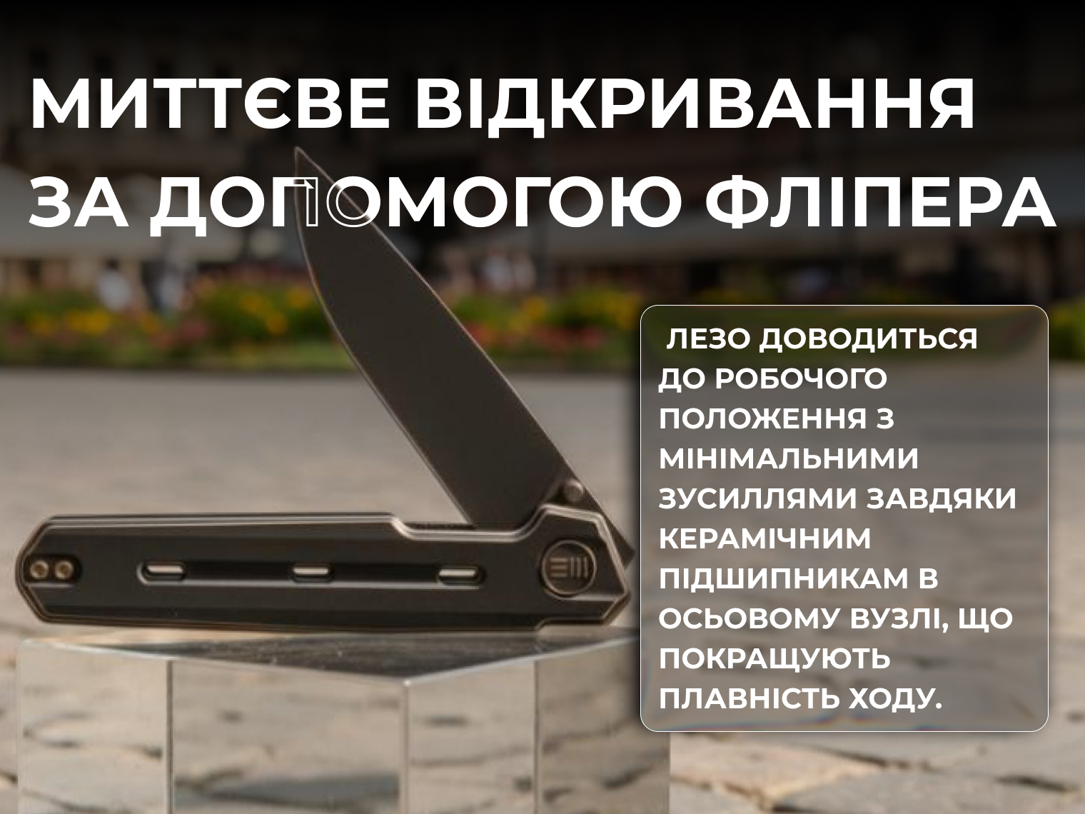 Ніж відкривається миттєво — достатньо натиснути на плавець фліпера. Завдяки керамічним підшипникам в осьовому вузлі рух виходить плавним і передбачуваним, а дрібні насічки на обуху спрощують упор пальцем для максимального контролю леза під час силових робіт.