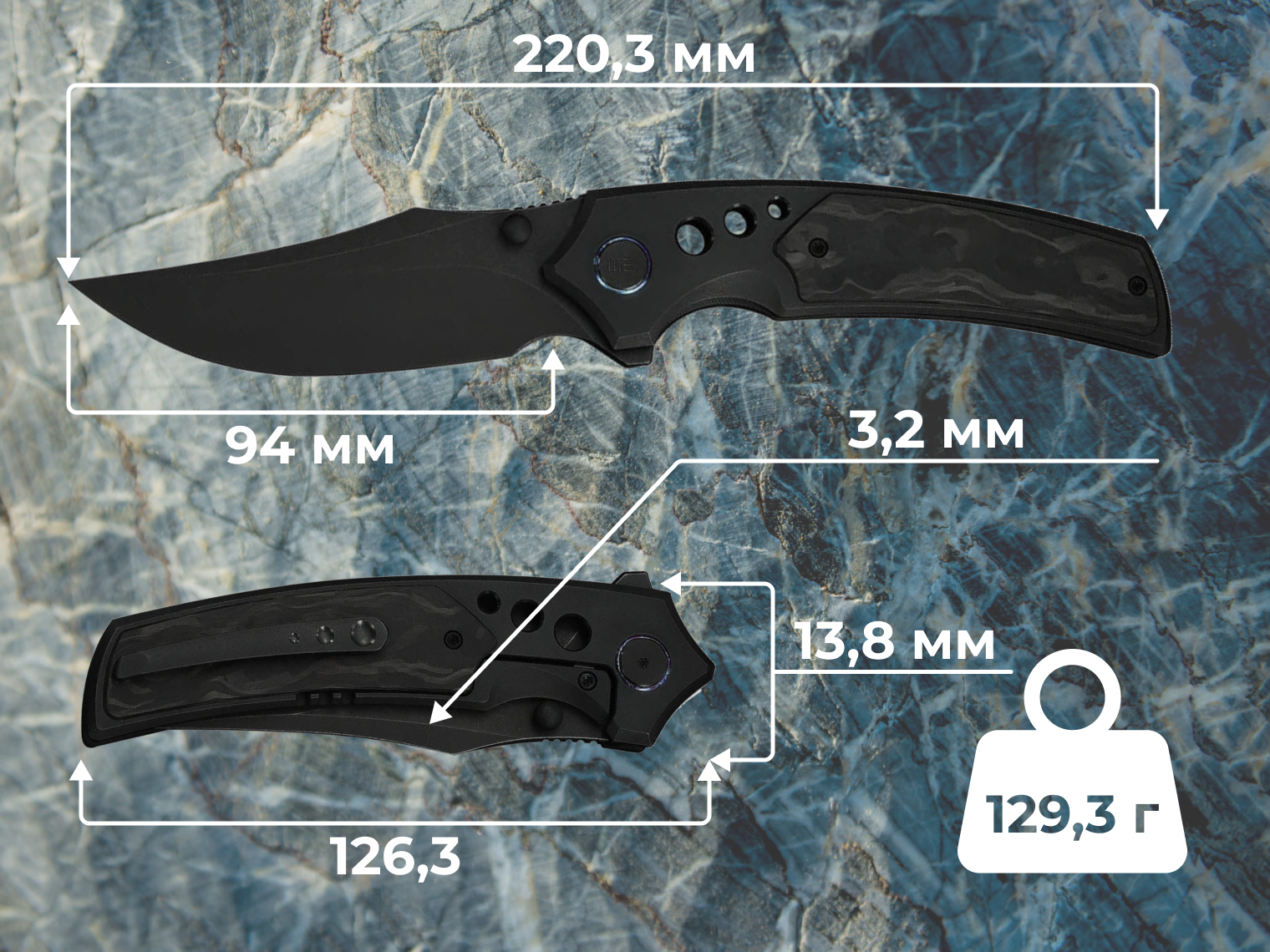 Преміальний складаний ніж із флагманської лінійки поєднує в собі передову порошкову сталь Bohler M390 та високоміцні сучасні сплави. Клинок профілю Clip Point має довжину 94 мм та фінішну обробку Black Stonewashed. Конструкція базується на титановому руків’ї зі вставками з мармурового карбону, що забезпечує ідеальний баланс міцності та легкості.