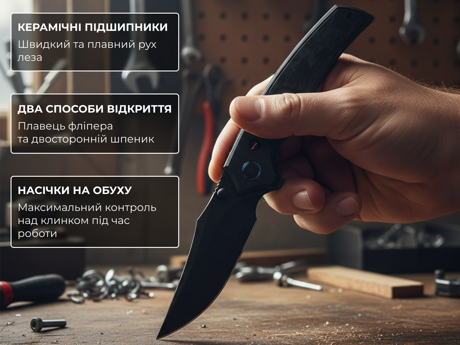 Серцем ножа є замок Bolster Lock, який надійно фіксує лезо, а система керамічних шарикопідшипників гарантує миттєвий та плавний вихід клинка. Форма Clip Point з плоским заточуванням забезпечує відмінну проникну здатність та контрольований чистий різ. Чорне матове покриття Stonewashed не лише надає ножу тактичного вигляду, а й ефективно приховує сліди експлуатації.