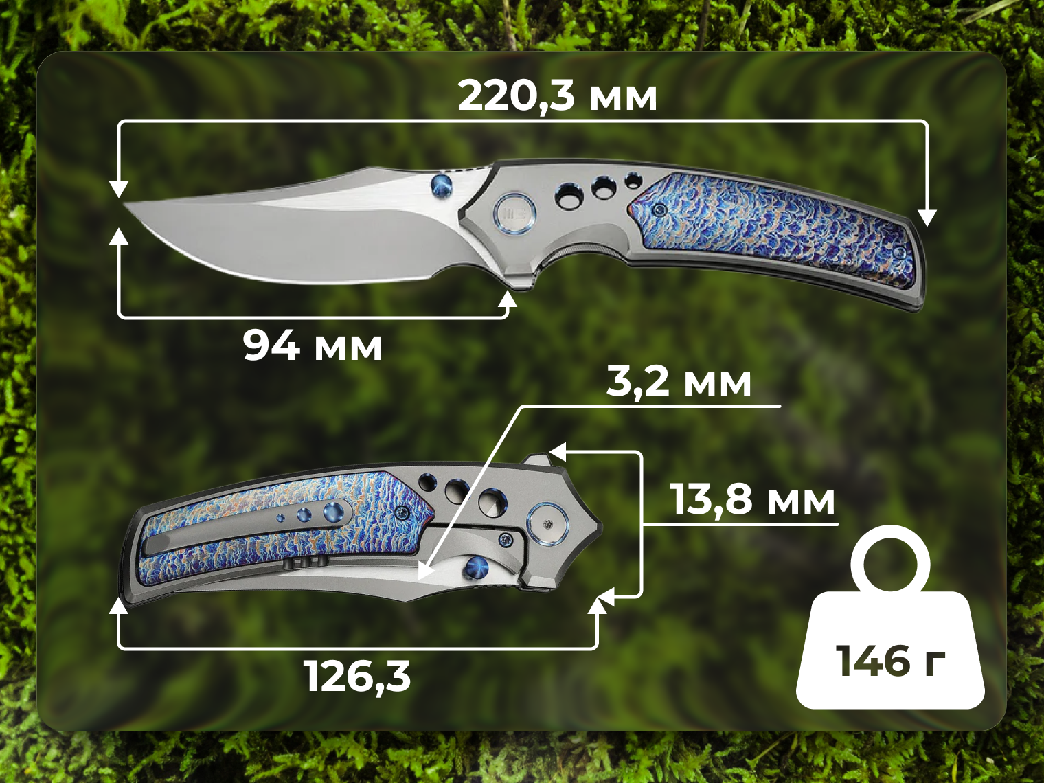 Повна довжина ножа у відкритому стані — 220,3 мм. Уся фурнітура, зокрема гвинти, кліпса, шпеньок та бекспейсер, також виготовлена з титану. Блакитні акценти на кліпсі гармоніюють із кольором руків'я, підкреслюючи преміальний статус моделі. При вазі у 146 г ніж відчувається монолітним та надійним інструментом.
