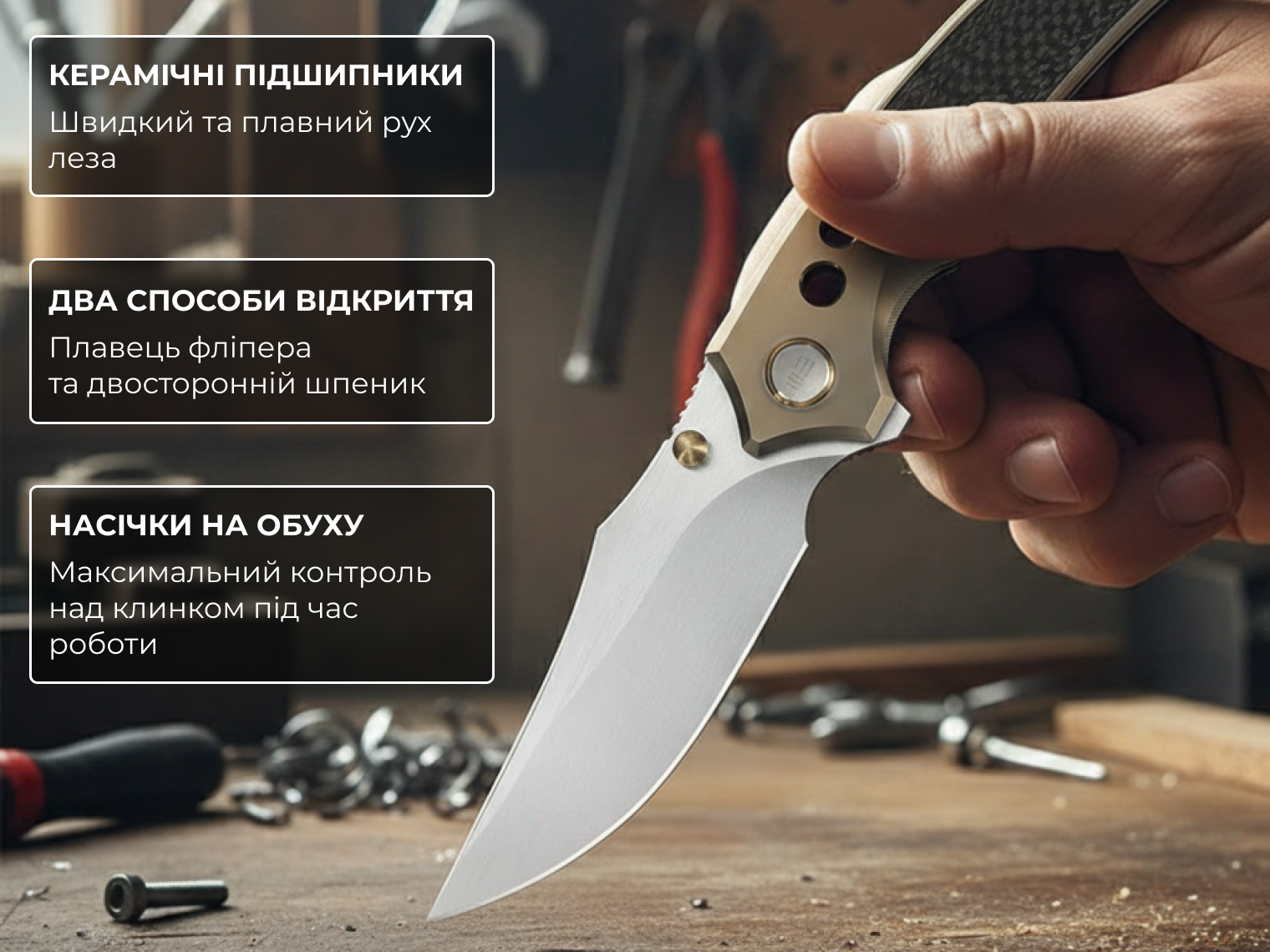 Преміальний складаний ніж із флагманської лінійки поєднує в собі передову порошкову сталь Bohler M390 та високоміцні сучасні сплави. Клинок профілю Clip Point має довжину 94 мм та преміальну фінішну обробку Hand Rubbed Satin. Конструкція базується на титановому руків’ї кольору Champagne зі вставками з плетеного карбону, що забезпечує ідеальний баланс міцності та легкості.