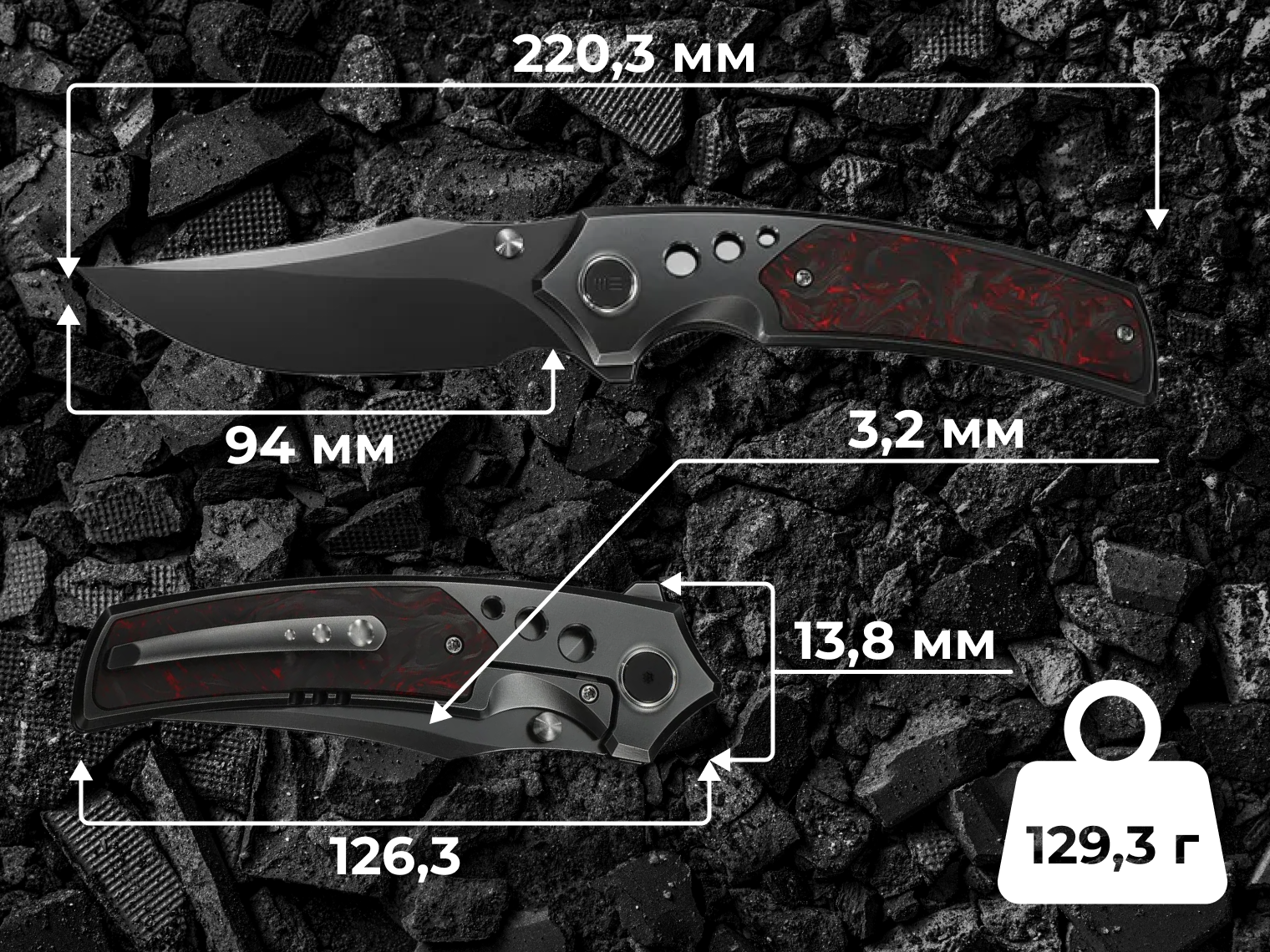 Преміальний складаний ніж із флагманської лінійки поєднує в собі передову порошкову сталь Bohler M390 та високоміцні сучасні сплави. Клинок профілю Clip Point має довжину 94 мм та унікальну фінішну обробку Polished Gray. Конструкція базується на титановому руків’ї зі вставками з чорно-червоного карбону, що забезпечує ідеальний баланс міцності та легкості.
