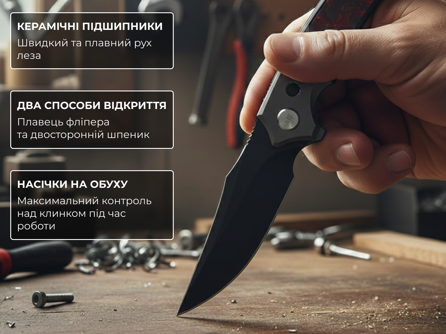 - матеріал руківʼя — титан 6AL4V (Polished Gray) + вставки Black & Red Carbon Fiber;