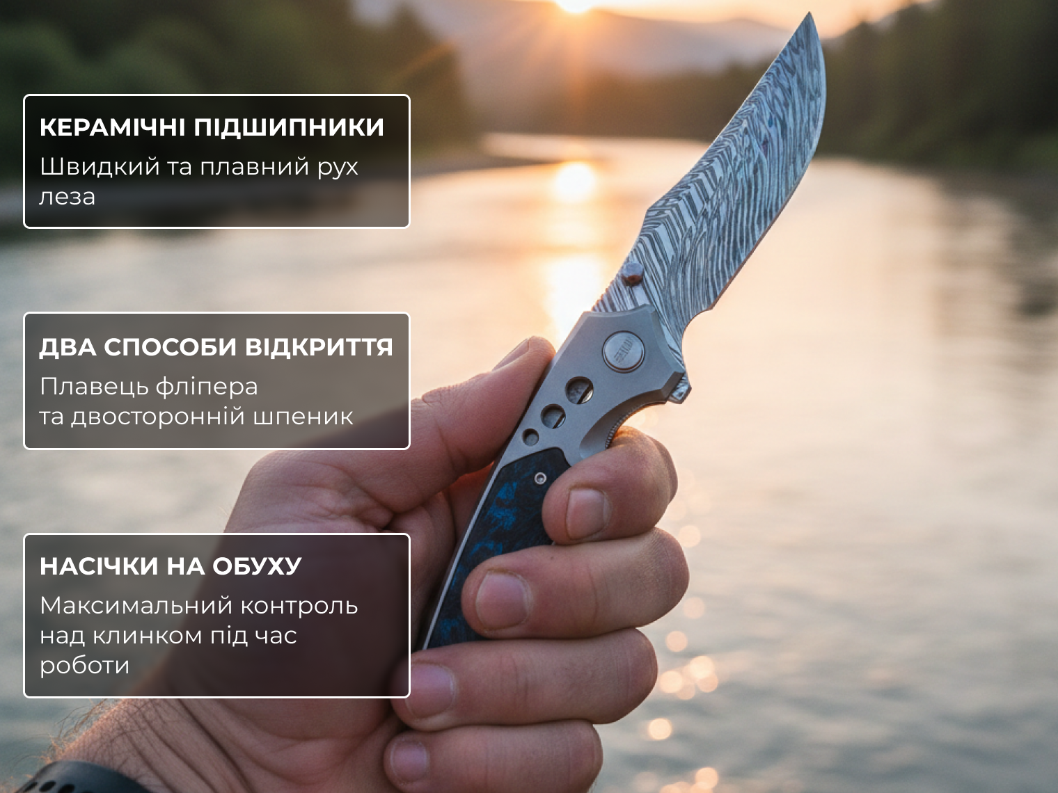 - матеріал фурнітури та Pivot Cap — титан 6AL4V / Damasteel.